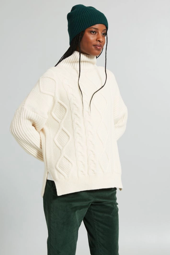 Cuffia realizzata in filato di lana, viscosa e cashmere, con lavorazione a coste e fondo risvoltato.