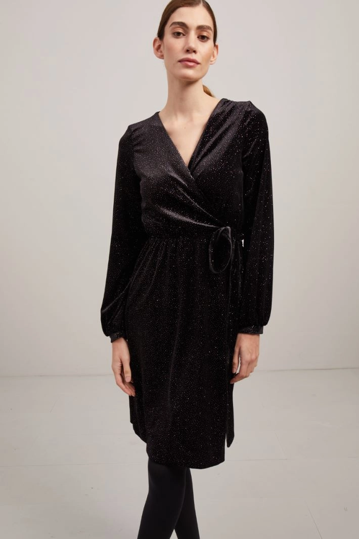 Abito a portafoglio realizzato in ciniglia stretch, con scollo a V maniche lunghe con polsino e inserto elastico in vita. Sfoderato.