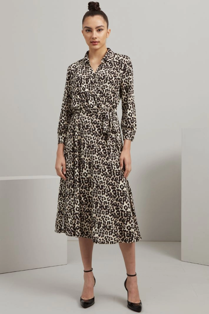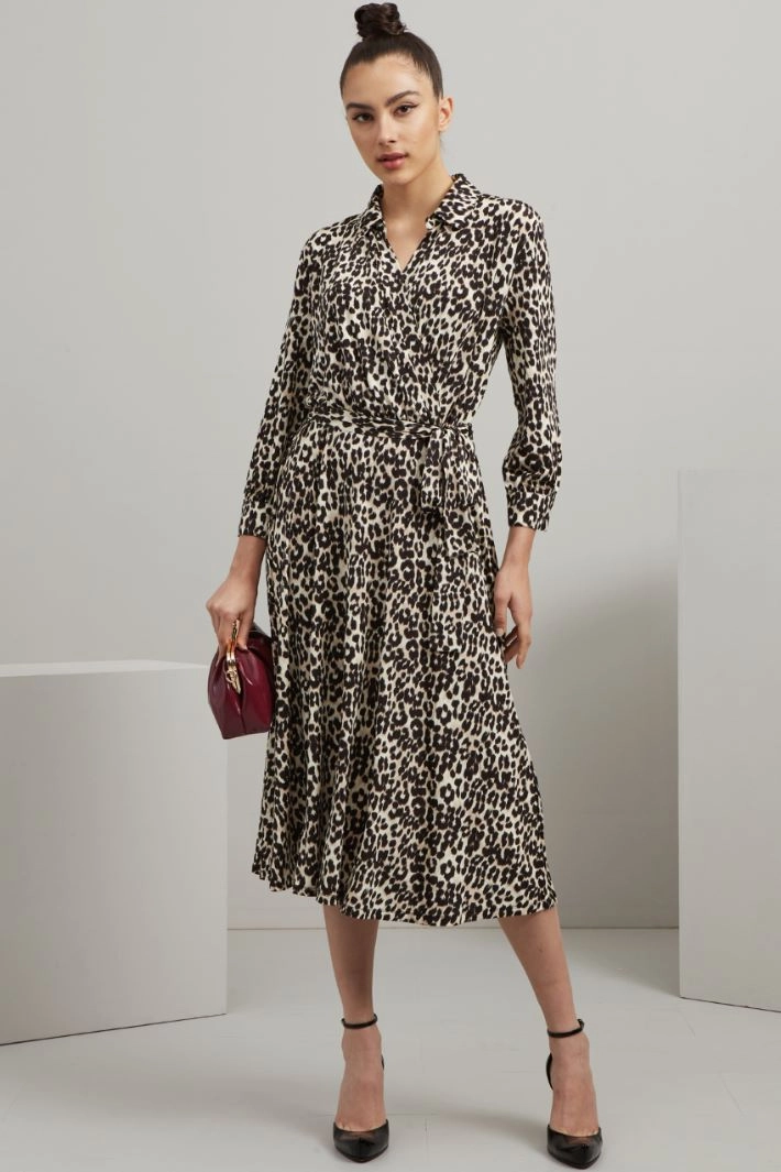 Abito lungo dalla linea svasata realizzato in jersey di misto viscosa stampato, con collo a camicia e apertura a V, maniche lunghe con polsino e bottone, inserto elastico in vita, spacco al fondo e cintura coordinata.