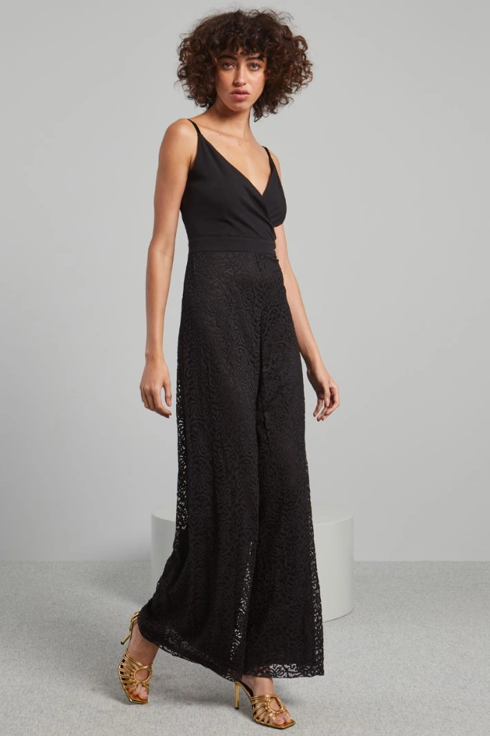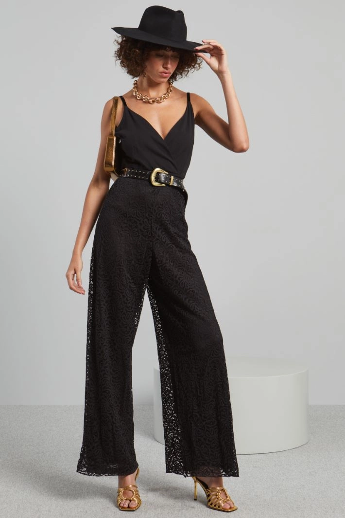 Tuta lunga dalla linea morbida con corpino realizzato in jersey di cotone stretch, scollo a V incrociato e spalline sottili in velluto. Pantaloni a palazzo realizzati in pizzo di misto cotone. Allacciatura tramite zip invisibile sul retro. Capo semifoderato.