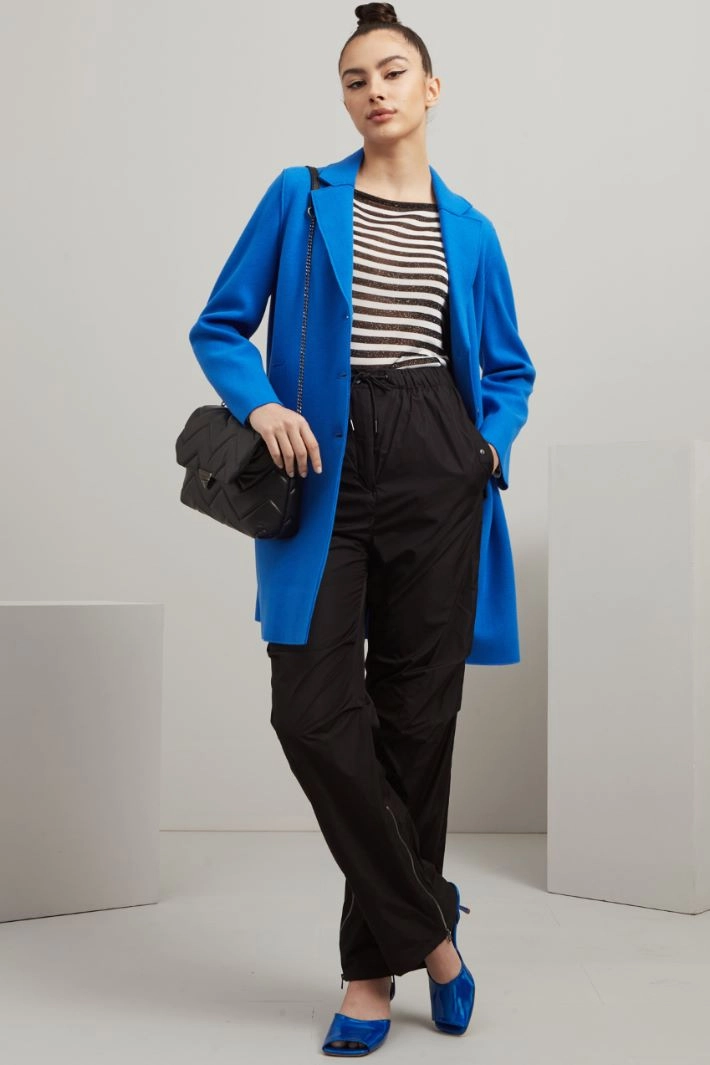 Cappotto dalla linea dritta realizzato in jersey compatto di lana, con collo rever, maniche lunghe e tasche a filettone. Allacciatura monopetto tramite bottoni a vista. Sfoderato.