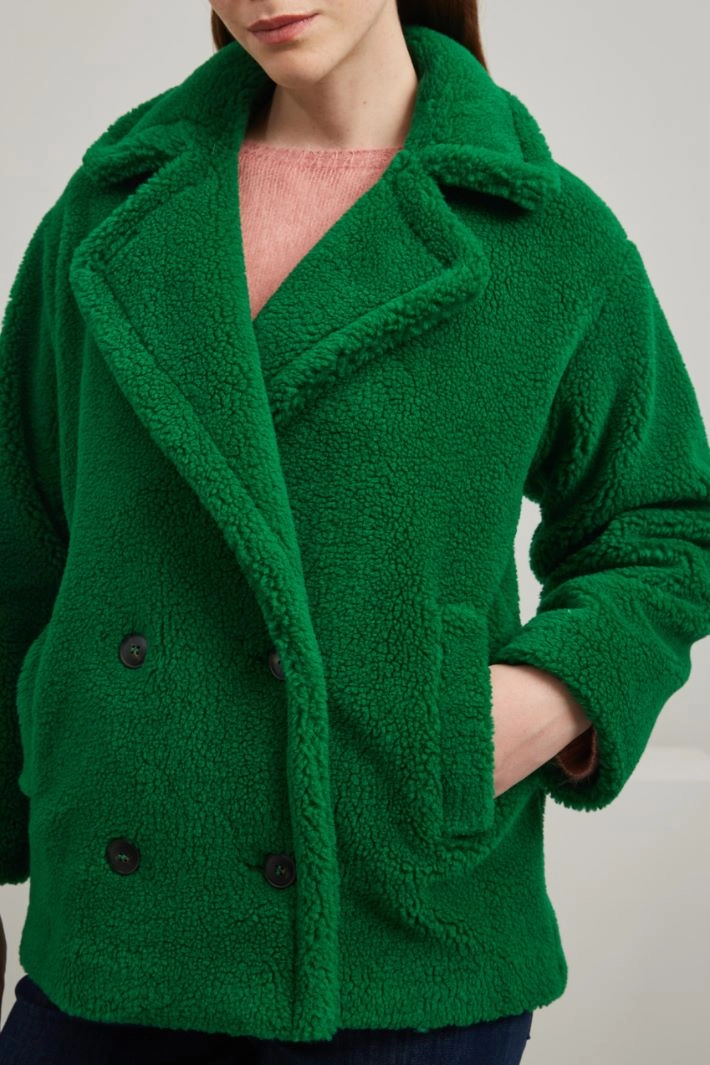 Cappotto corto realizzato in tessuto di misto lana effetto peluche, con collo a rever, maniche lunghe, tasche a filettone e allacciatura doppiopetto tramite bottoni. Capo foderato.