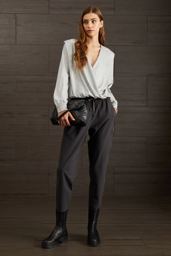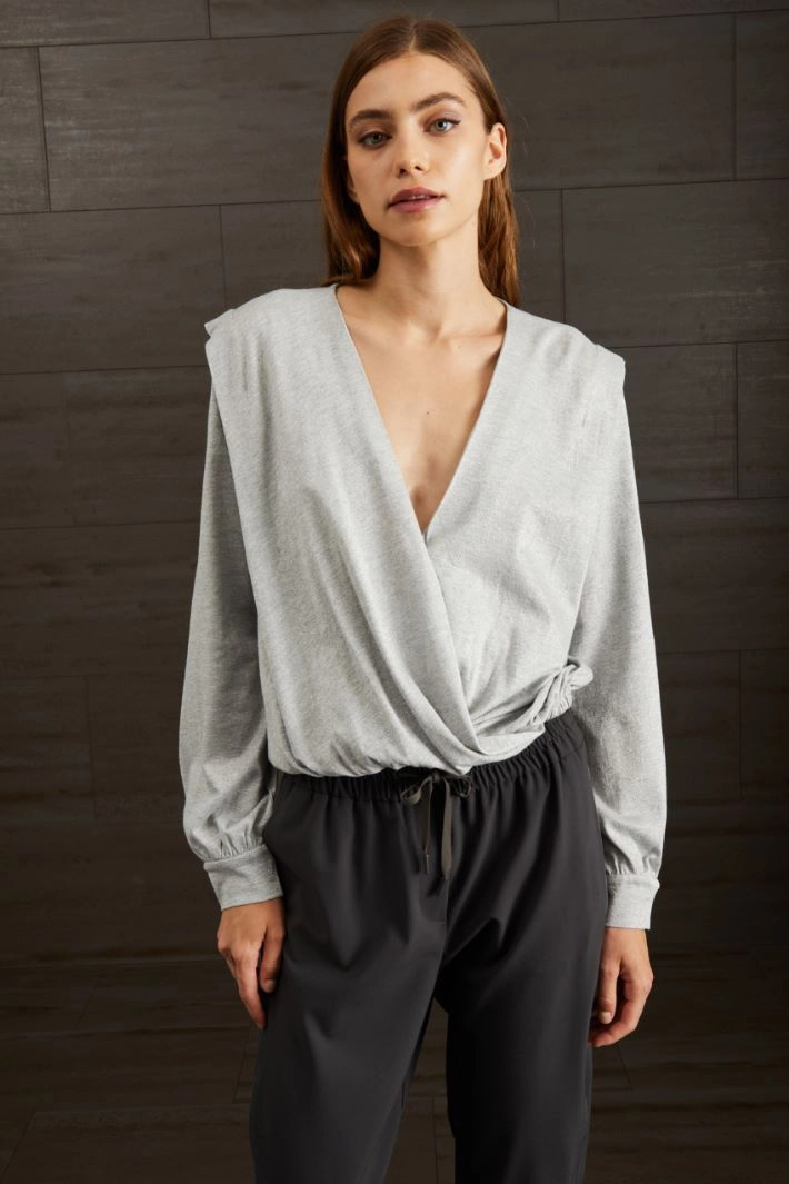 Top corto dalla linea morbida realizzato in jersey di misto viscosa lamè, con scollo incrociato a V e bottone, maniche lunghe con polsino e inserto elastico in vita.