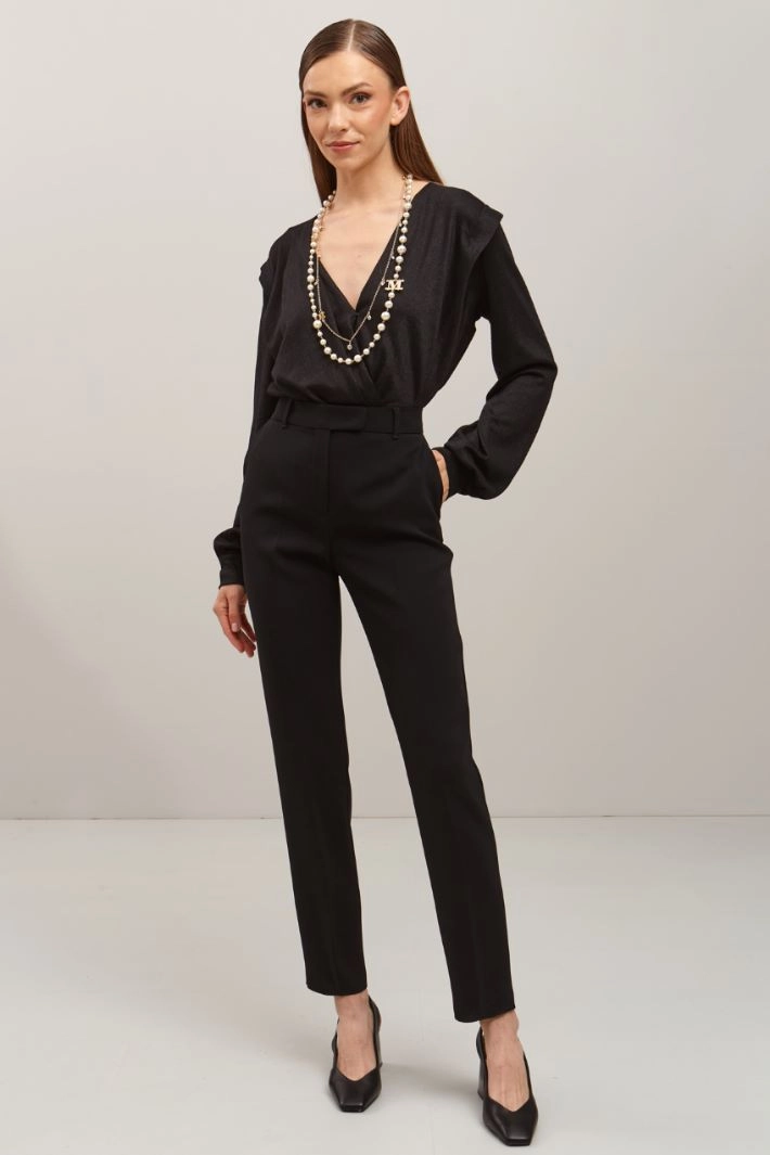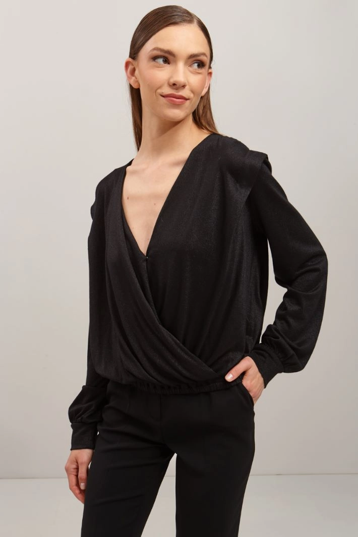 Top corto dalla linea morbida realizzato in jersey di misto viscosa lamè, con scollo incrociato a V e bottone, maniche lunghe con polsino e inserto elastico in vita.
