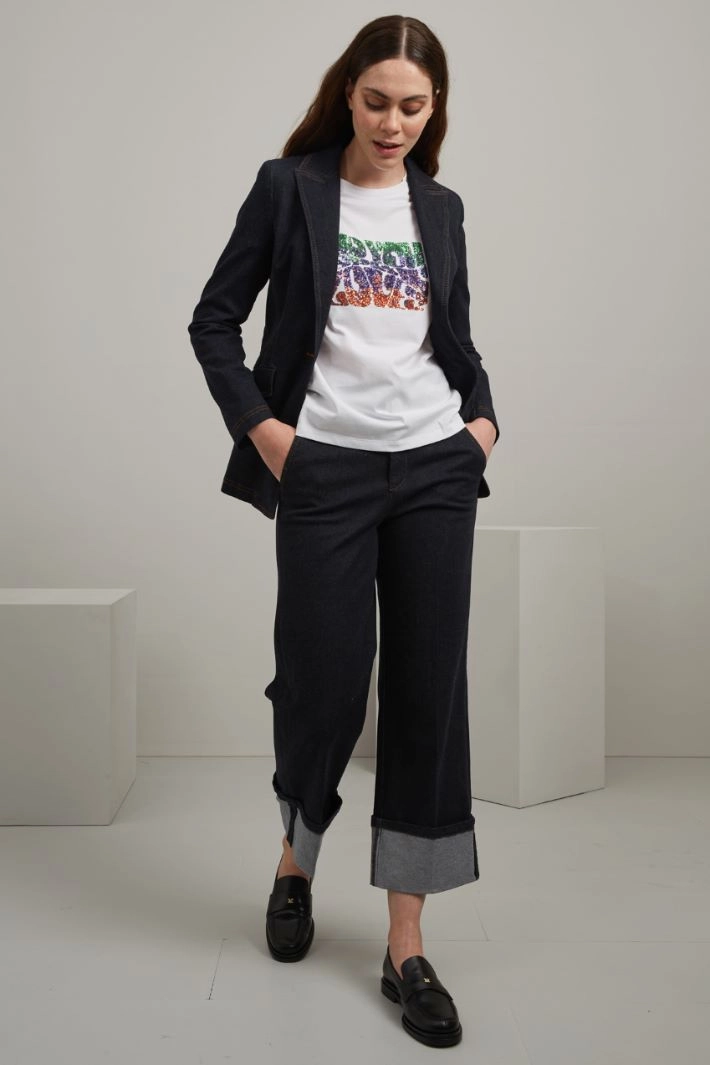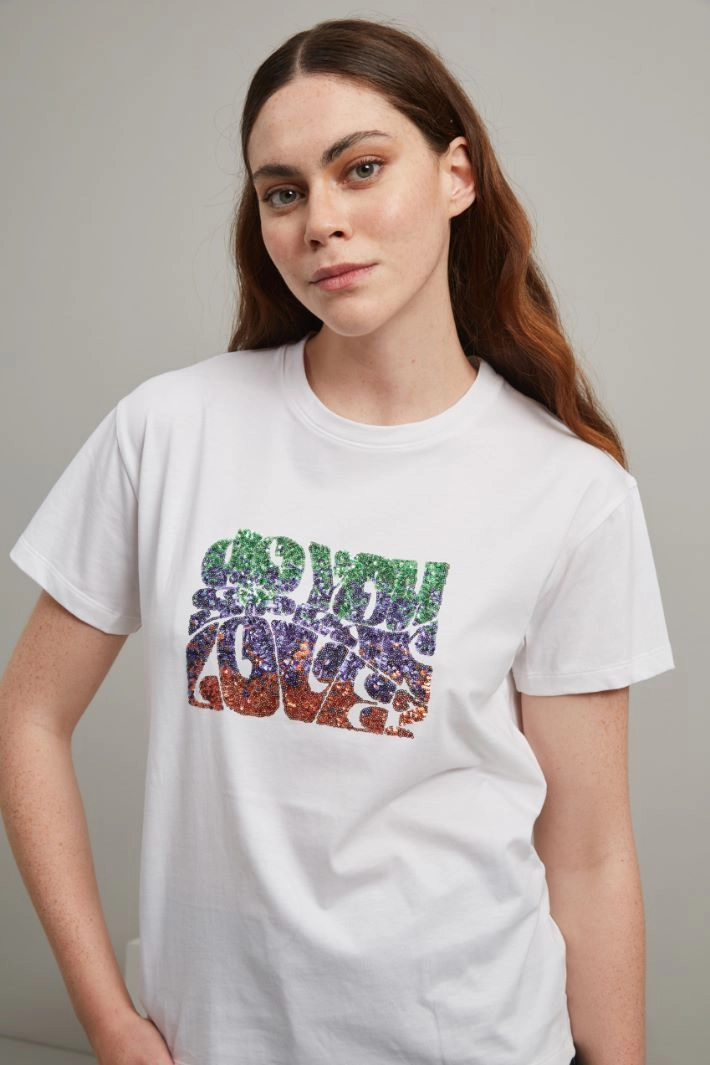 T-shirt dalla linea dritta realizzata in jersey di puro cotone, con motivo di paillettes ricamate, scollo rotondo e maniche corte.