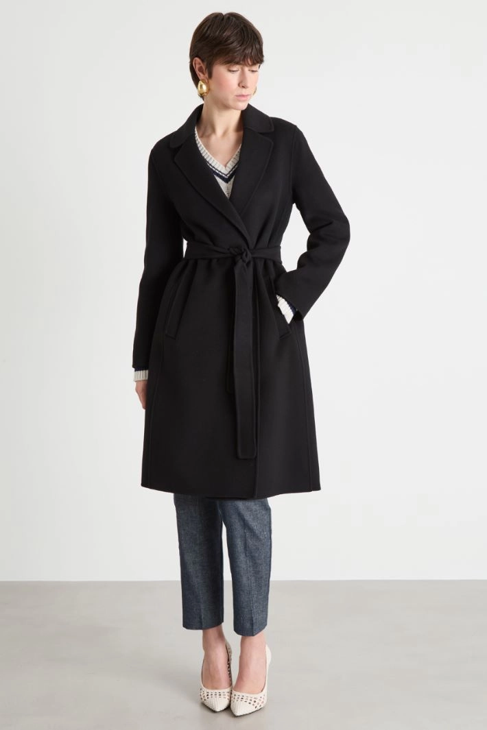 Cappotto midi dalla linea dritta in doppio tessuto di pura lana, con scollo a rever, maniche lunghe, tasche a filettone, spacco centrale sul retro. Chiusura con cintura abbinata.