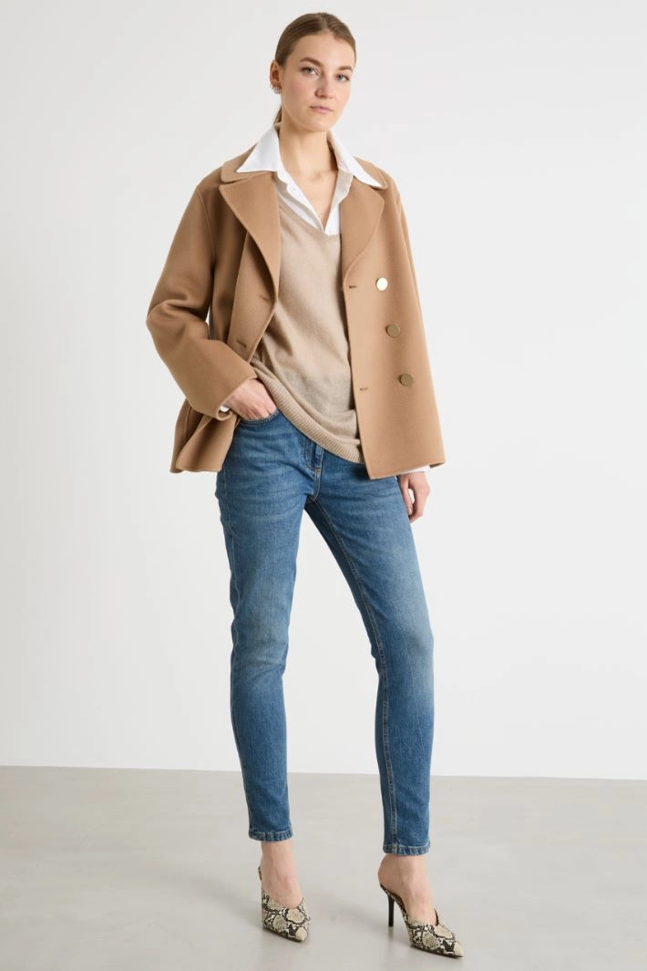 Giacca doppiopetto dalla linea dritta in doppio drap di pura lana, con scollo a rever, maniche lunghe, tasche a filettone sul davanti, spacco centrale sul retro. Chiusura con bottoni.