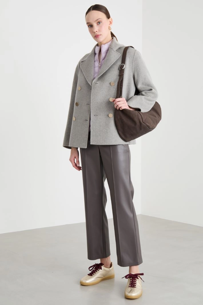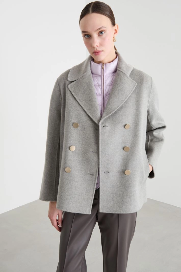 Giacca doppiopetto dalla linea dritta in doppio drap di pura lana, con scollo a rever, maniche lunghe, tasche a filettone sul davanti, spacco centrale sul retro. Chiusura con bottoni.