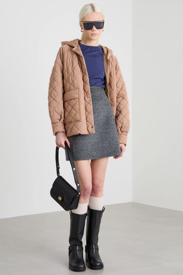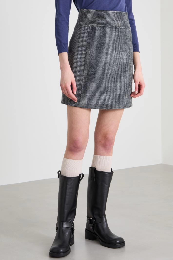 Gonna dalla linea regolare realizzata in tessuto doppio di misto lana e mohair, con allacciatura tramite zip invisibile sul retro.