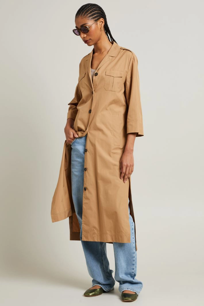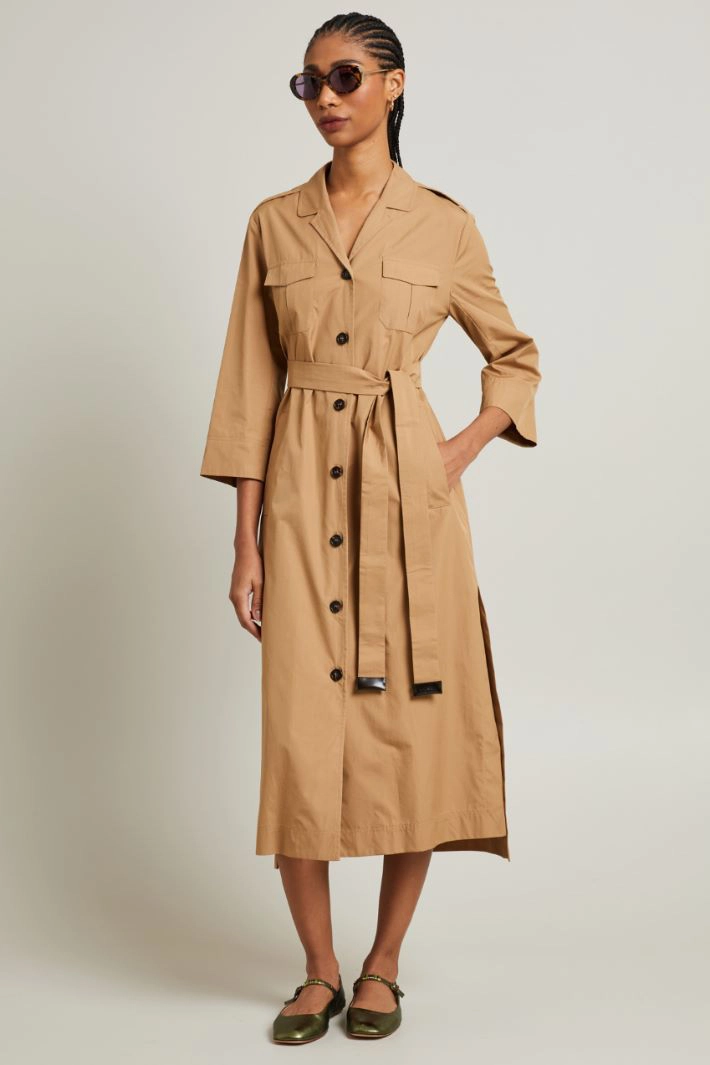 Abito dritto stile trench dalla linea leggermente svasata, realizzato in popeline di puro cotone, con colletto bowling, maniche a tre quarti, tasche con patta e soffietto applicate sul petto e a filetto sui fianchi. Spacchetti laterali sul fondo, cintura coordinata in abbinamento e allacciatura frontale tramite bottoni.